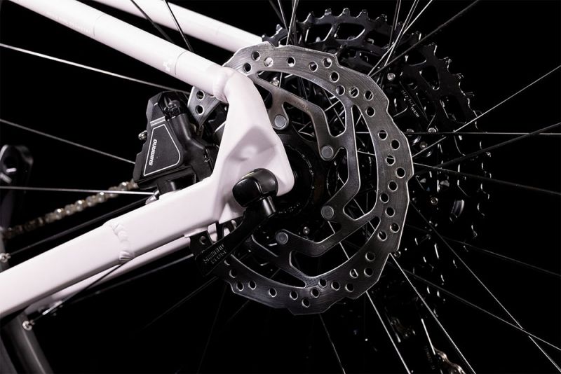 Auf dem Weg bergab bremsen die leistungsstarken hydraulischen Shimano Scheibenbremsen mit großen Rotor am Vorderrad das Bike zuverlässig und kontrolliert ab. Verantwortlich für den hohen Fahrkomfort ist die einfach einstellbare und geschmeidig arbeitende RockShox Luftfedergabel. Fazit: individuell abgestimmte Performance, wie frau sie sich wünscht.