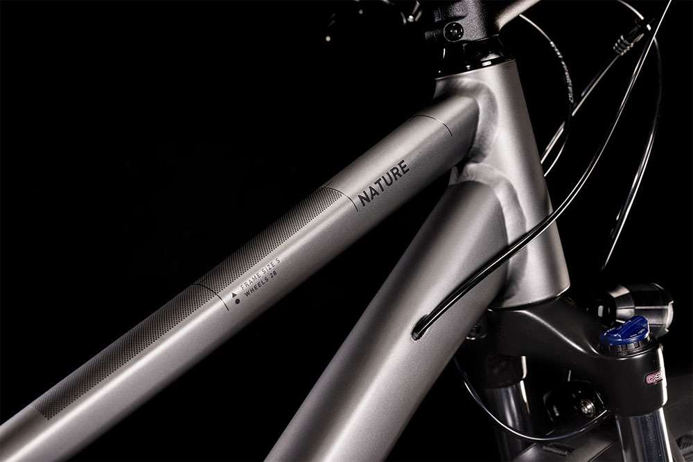 Je leichter ein Bike, desto besser sein Fahrverhalten. Deshalb besteht der Nature Allroad Rahmen auch aus doppelt konfizierten Aluminiumrohren, was sein Gewicht niedrig hält, ohne dass Belastbarkeit und Langlebigkeit verloren gehen. Er bietet zudem genügend Reifenfreiheit für bis zu 50 mm breite Reifen und damit mehr Fahrkomfort sowie ein konisches Steuerrohr für 1a-Lenkpräzision. Wir finden außerdem, dass ein Bike genauso gut aussehen sollte, wie es sich fährt. Somit unterstreichen neben den im Smooth Welding Verfahren konstruierten Hauptgelenken elegante Montagepunkte für das mitgelieferte Zubehör den anmutigen Look. Und dass das Chassis – wie alle unsere Rahmen übrigens – unsere strengen hauseigenen Sicherheitstests mit Bravour bestanden hat, versteht sich von selbst. Damit fährt es sich gleich noch entspannter. Und länger!