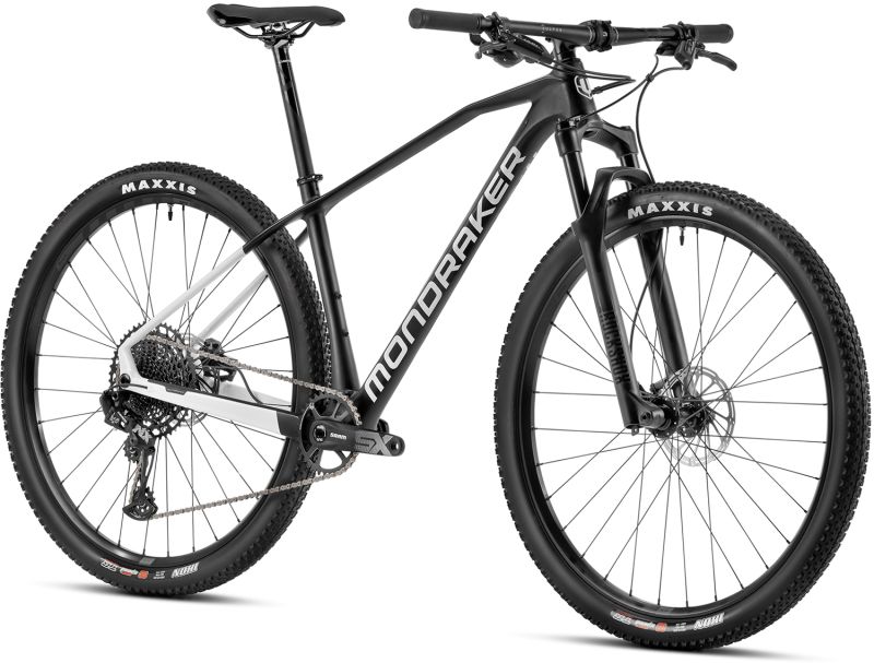 Der auffällige, stabile und richtig steife Carbon-Rahmen besticht nicht nur durch Komfort und Design, sondern kommt auch mit der innovativen Mondraker Forward Geometry: der längere Reach, der durch das verlängerte Oberrohr entsteht, ermöglicht einen längeren Radstand, was mehr Kontrolle und Souveränität verspricht. Der Fahrer rückt weiter vom Vorderrad weg, weshalb der Vorbau sehr kurz ausfällt. SRAM-Bremsen mit 160 mm Bremsscheibe vorne wie hinten verzögern auch bei harten Abfahrten extrem gut ohne nachzulassen. Die SRAM SX Eagle Kurbel mit 34 Zähnen und die SRAM Eagle 12-fach Kassette decken eine große Bandbreite ab, so dass auch die steilsten Trails zu bezwingen sind. Die 29“ Maxxis Ikon Reifen sorgen für besten Kontakt zum Gelände.